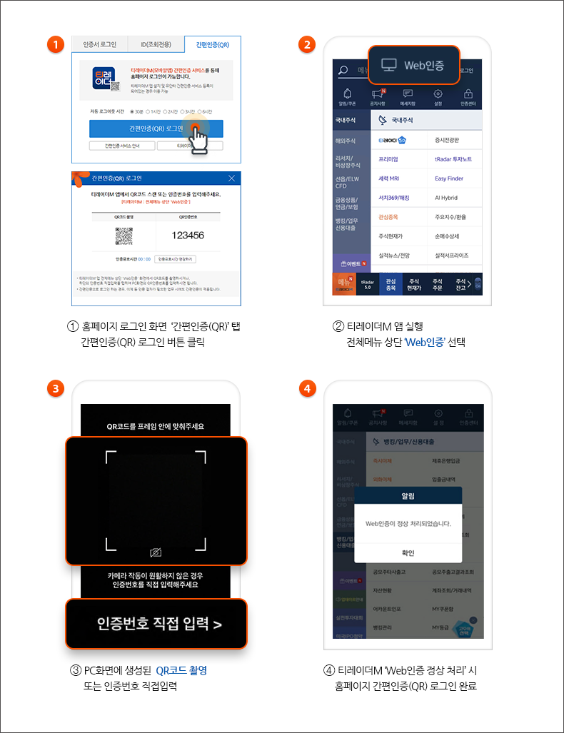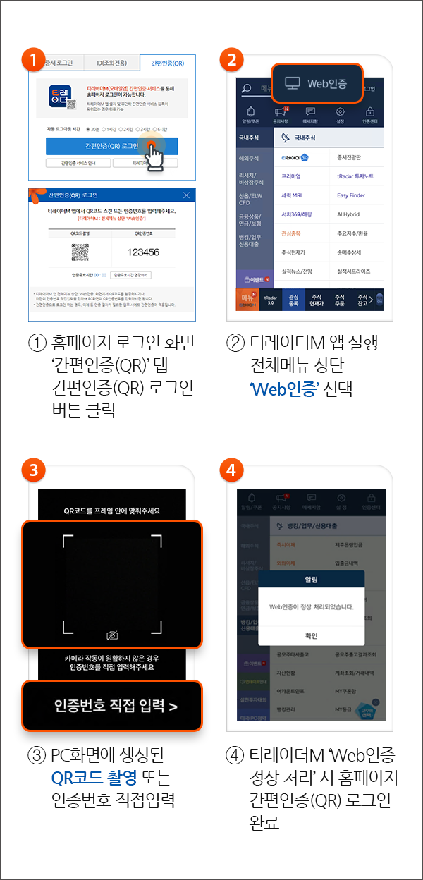 홈페이지 간편인증(QR) 서비스는 티레이더M 앱에서 '유안타 간편인증' 등록 후 이용하실 수 있습니다.