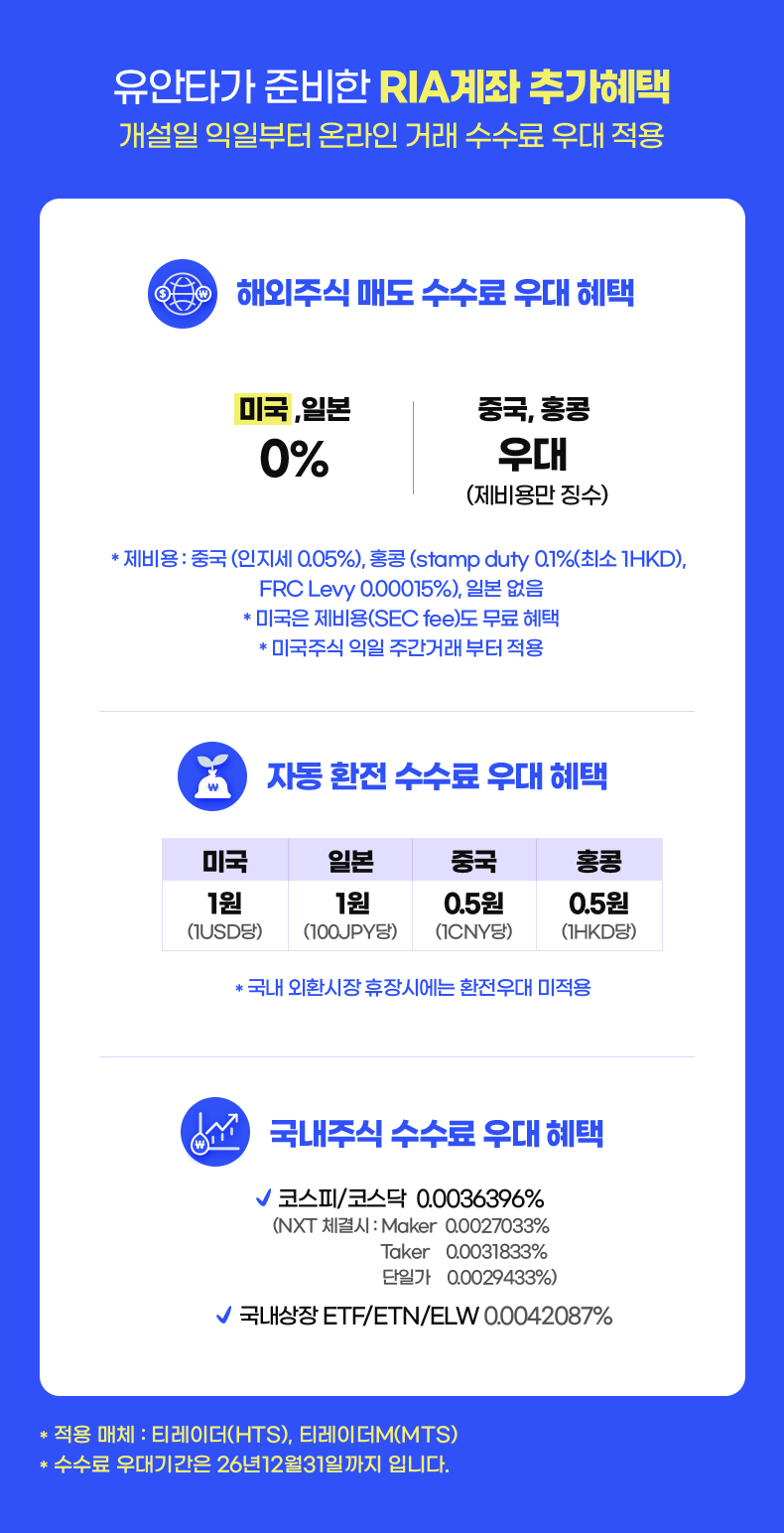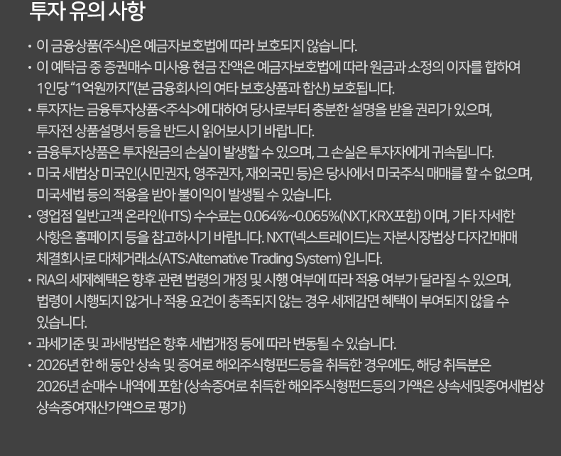 • 해외주식 매도시 제비용이 별도 부과됩니다. [상해A/심천A 0.05%, 홍콩 Stamp Duty 0.1%(최소 1HKD)&FRC Levy 0.00015%(소수점 셋째자리에서 반올림하여 최소 0.01HKD), 대만 0.3%(Day Trading 0.15%/ETF 0.1%), 2026년 4월 2일부터 미국 SEC fee 0.00206%, 일본은 제비용 없음] 단, 미국주식은 당사가 정한 기준에 따라 RIA계좌에서 매도 시 미국주식 제비용 무료 혜택이 적용됩니다.