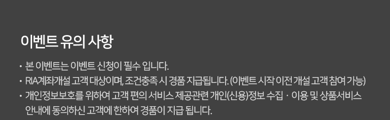 • RIA계좌개설 고객 대상이며, 조건충족 시 경품 지급됩니다. (이벤트 시작 이전 개설 고객 참여 가능)