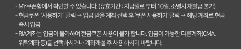 • - RIA계좌는 입금이 불가하여 현금쿠폰 사용이 불가 합니다. 입금이 가능한 다른계좌(CMA, 위탁계좌 등)를 선택하시거나 계좌개설 후 사용 하시기 바랍니다.